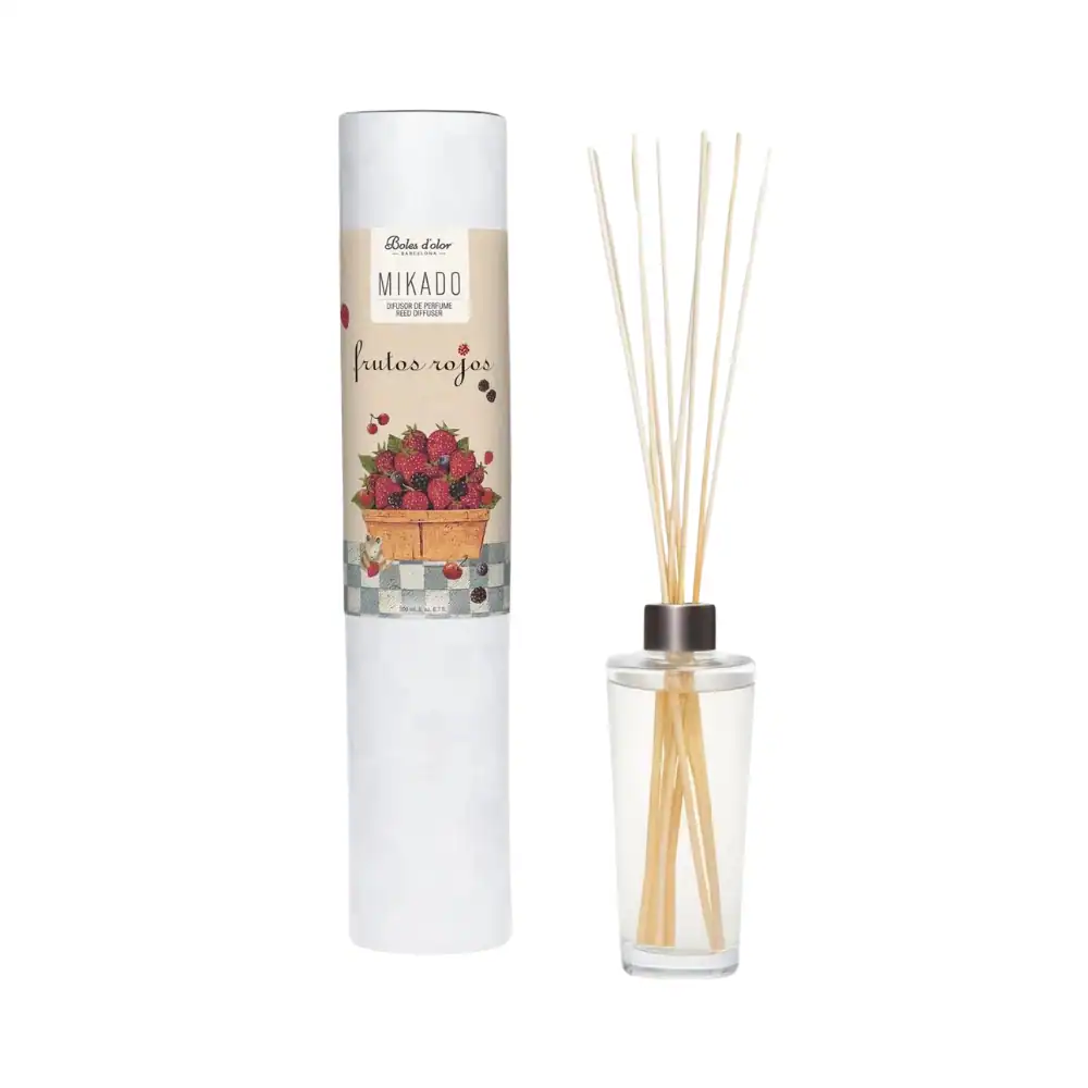 Nuestro Mikado Difusor Perfume Ambients Frutos Rojos Boles D’olor es la elección perfecta para aquellos que buscan una experiencia aromática intensa y deliciosa. Su diseño elegante y minimalista se combina con una fragancia que evoca los sabores más dulces de la naturaleza. Las varillas de ratán de alta calidad absorben la esencia y la liberan gradualmente, perfumando tu hogar durante semanas.