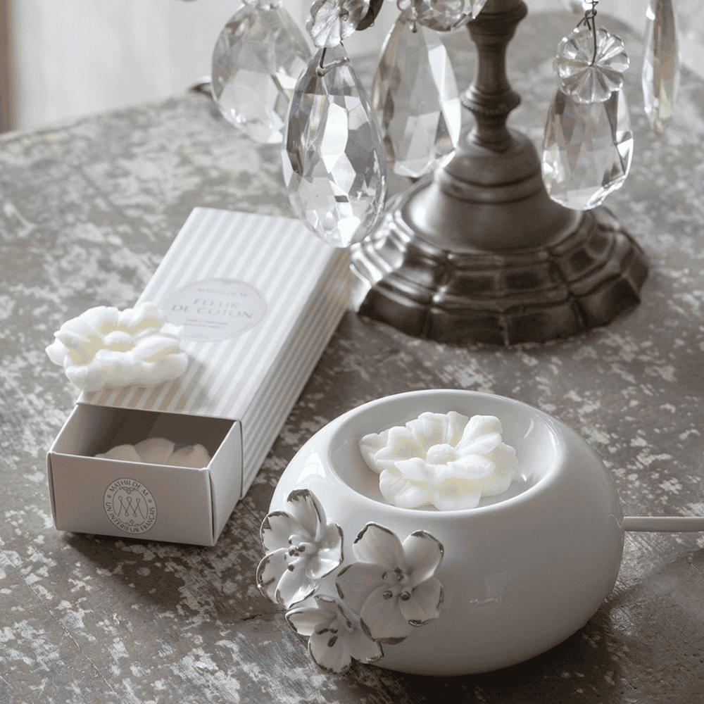 Déjate seducir por este Quemador eléctrico Amour de Fleurs, decorado con refinadas flores doradas de cerámica hechas a mano. Sencillo de utilizar y seguro, perfuma rápida e intensamente una habitación de tamaño medio. Coloca encima una o varias ceras perfumadas de Mathilde M y deja que se derritan suavemente. Las ceras liberan gradualmente su delicado aroma durante el proceso de calentamiento.